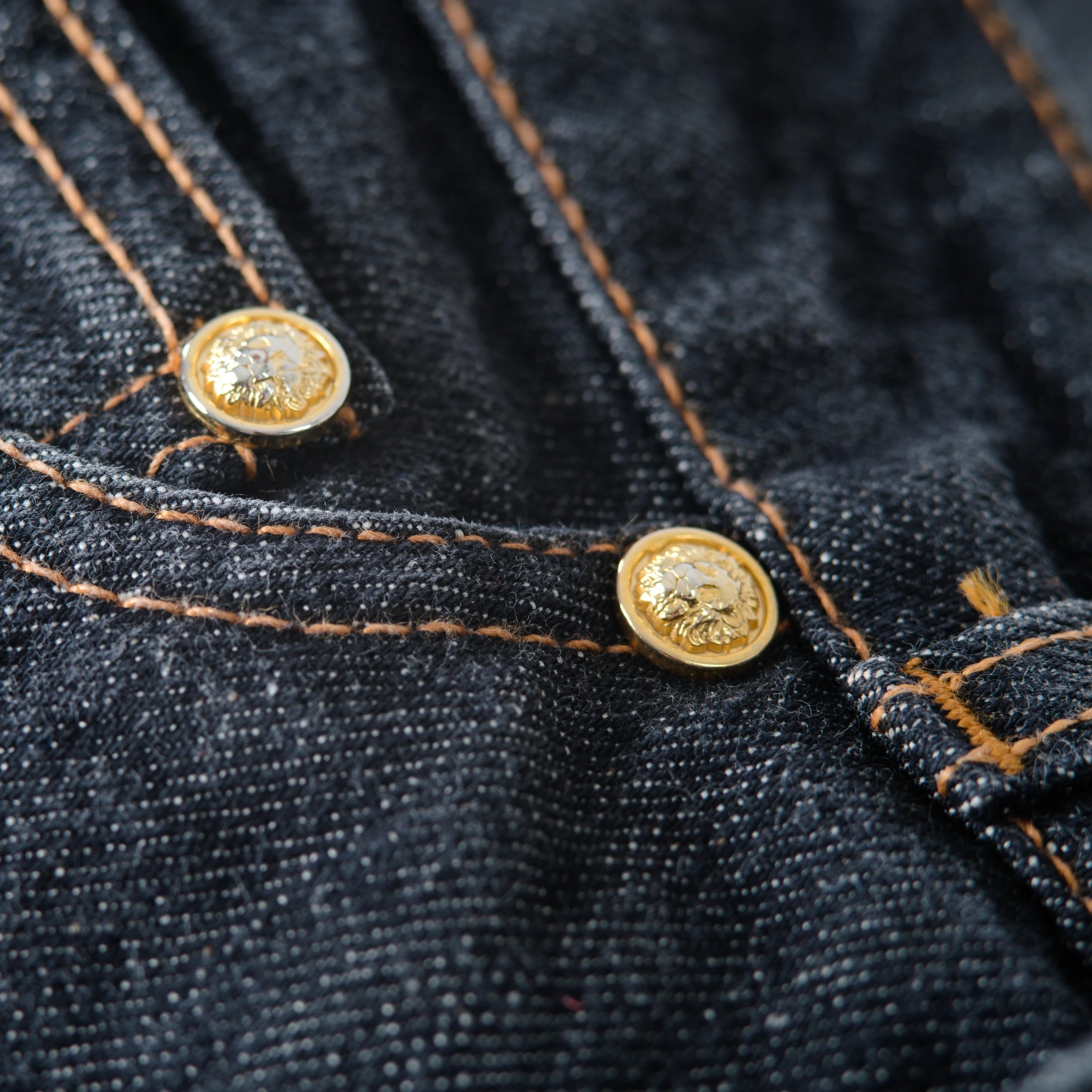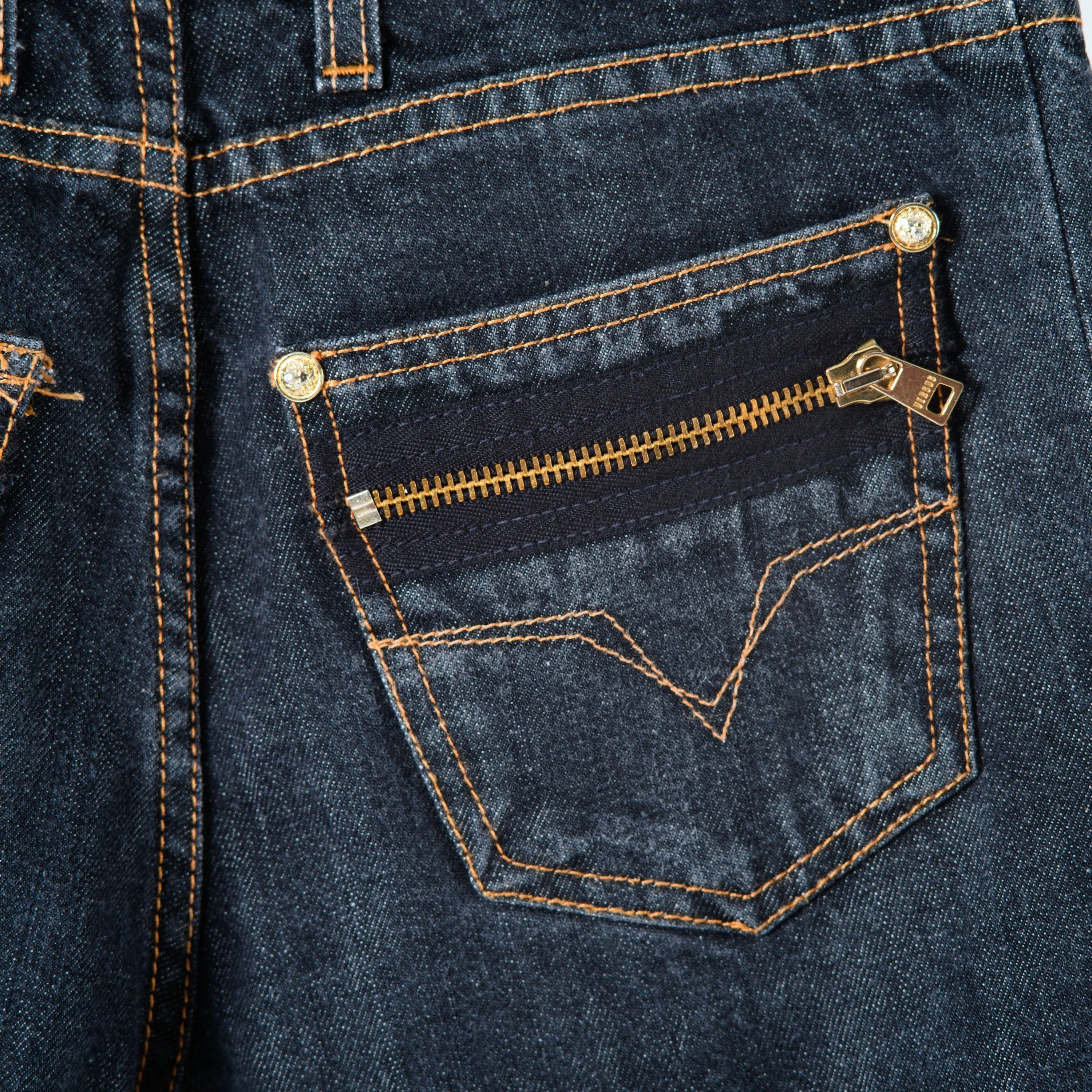 These Versus Versace Biker Jeans are crafted from high-quality dark-wash denim and feature distinctive gold-tone Medusa buttons and zipper details. The mid-low waist and slim, tapered cut create a flattering, structured silhouette. Back zip pockets and moto-inspired stitching add a bold, iconic Versus touch to these statement blue jeans.