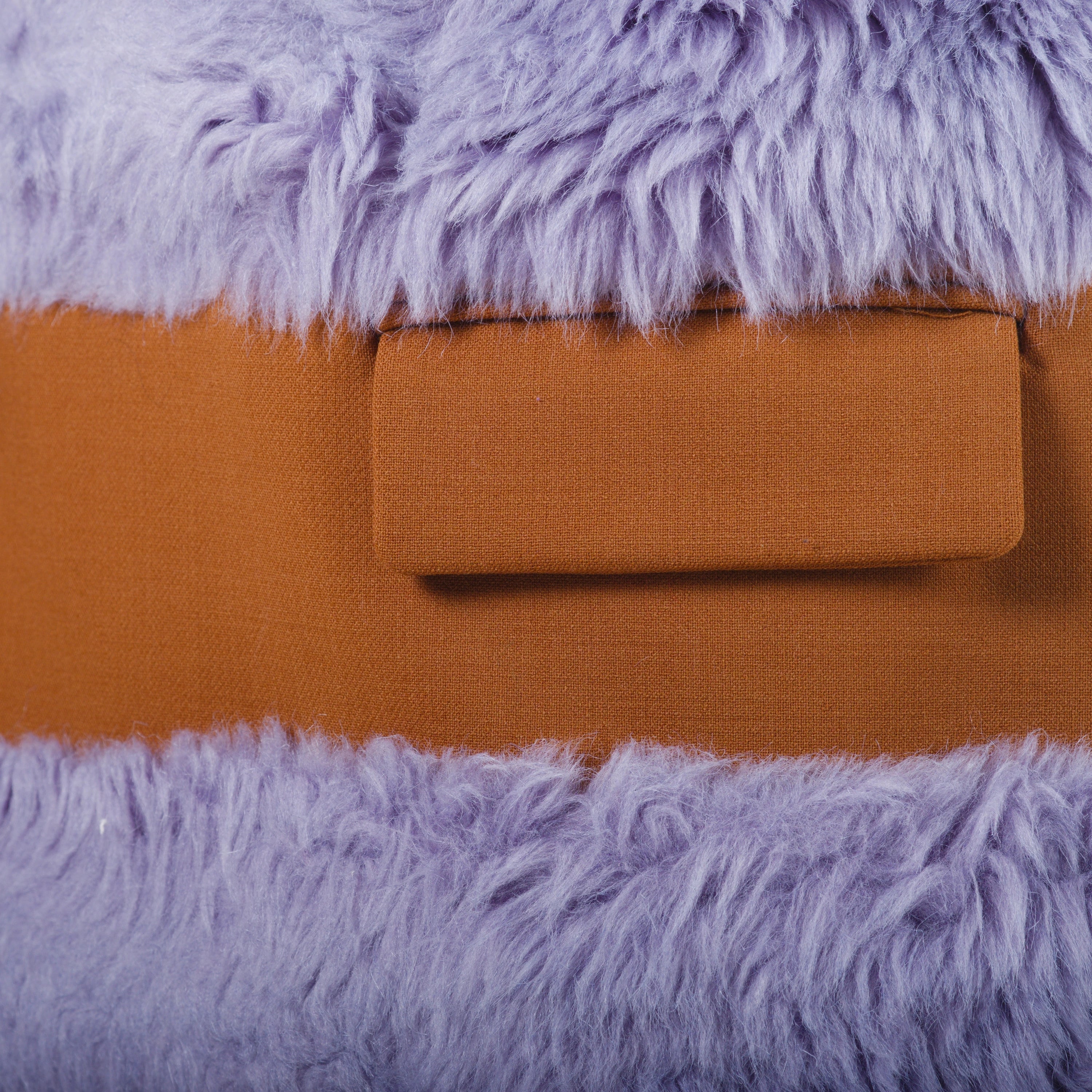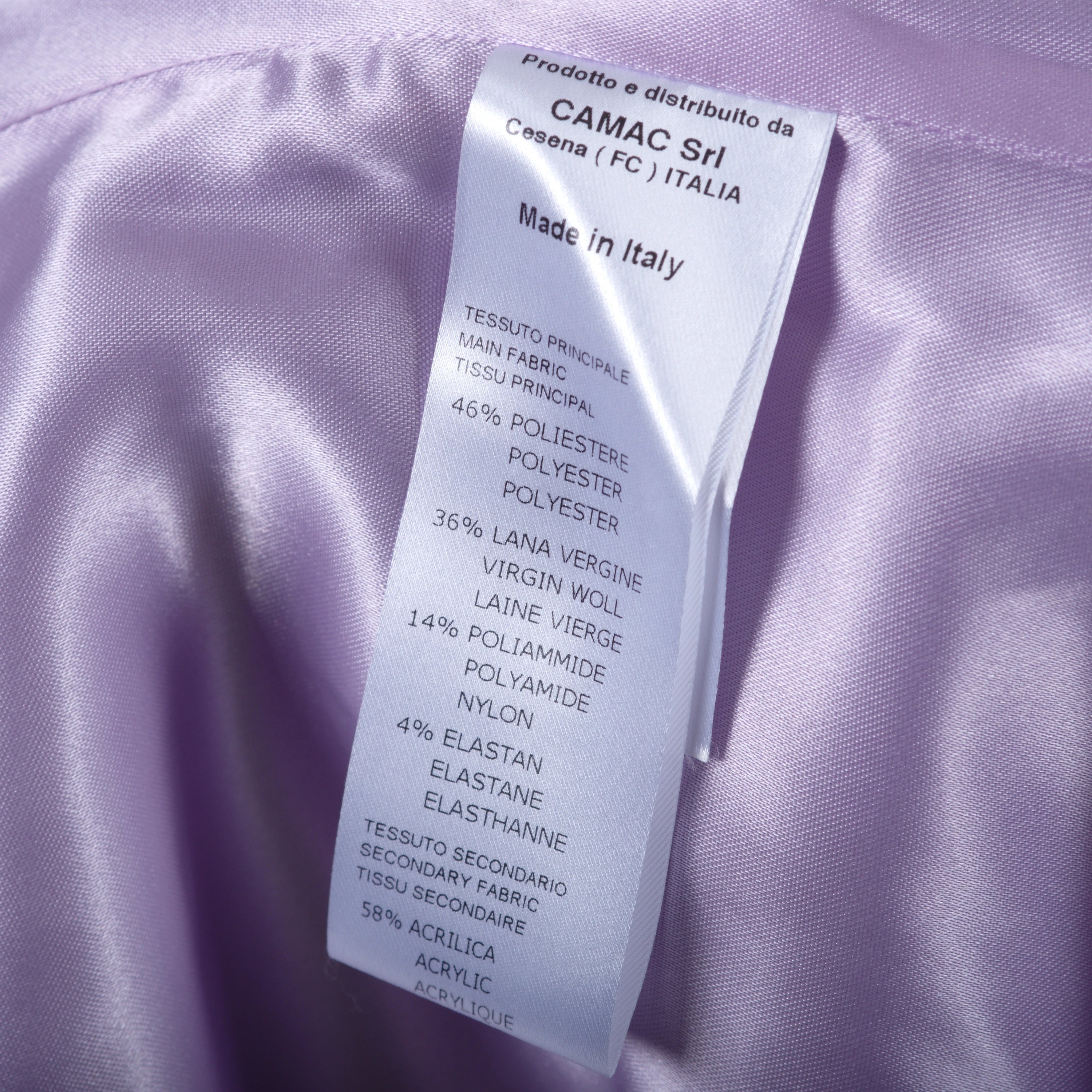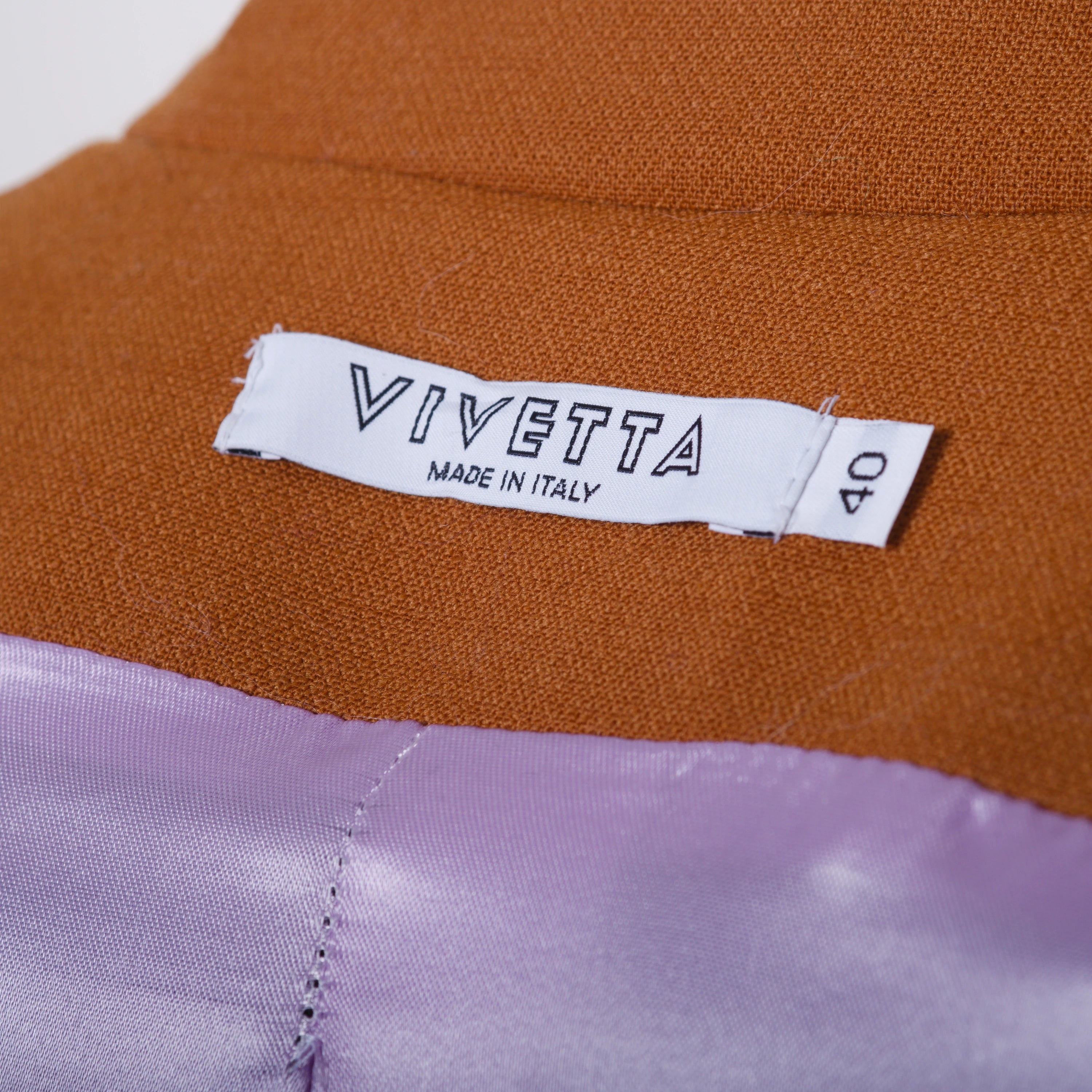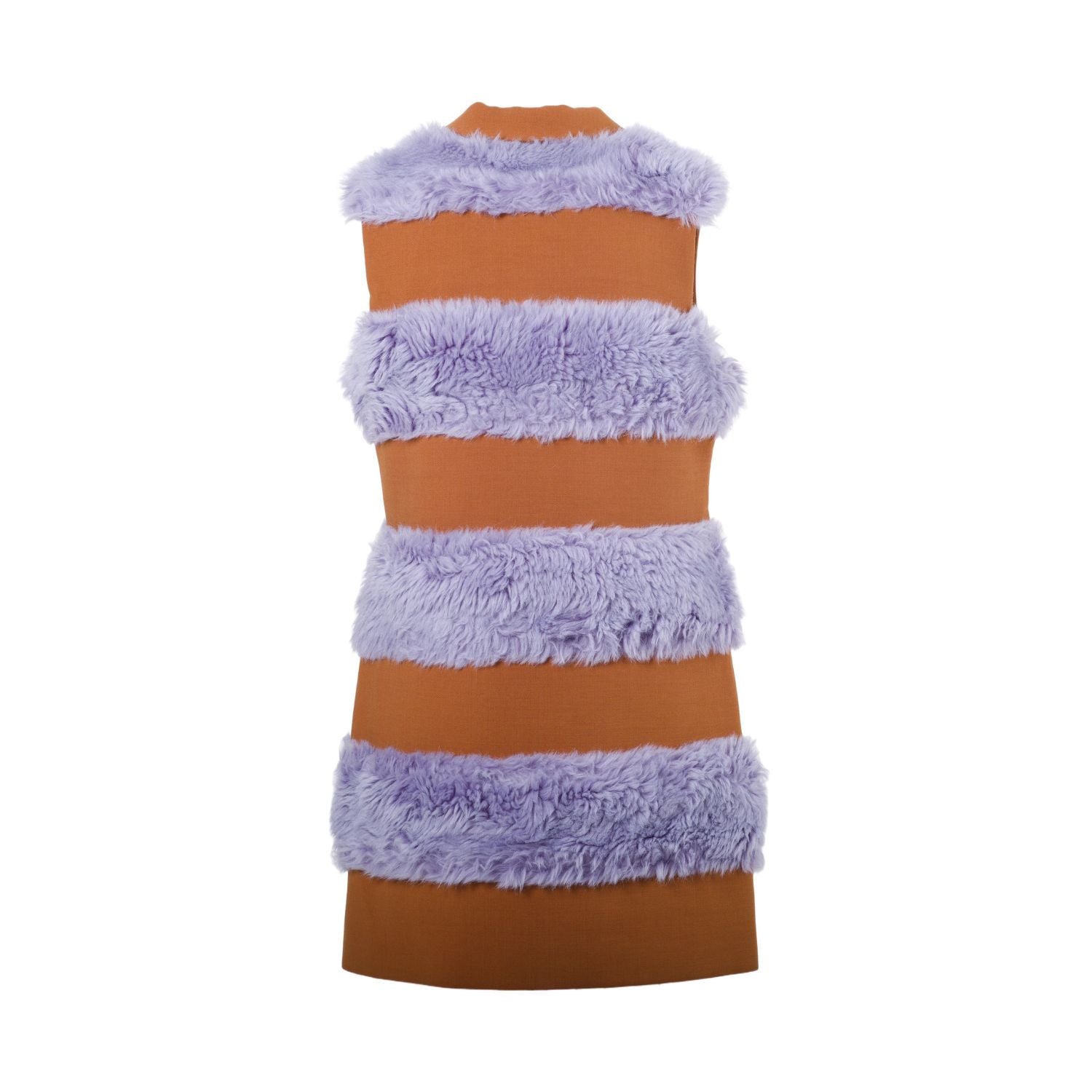 Striking sleeveless vest from Vivetta Autumn/Winter 2015–16 Ready-to-Wear, presented at London Fashion Week. Crafted in a structured wool-blend base in warm camel tones, the design is enhanced by contrasting lavender faux fur horizontal panels, creating a bold interplay between tailoring and playful femininity. Double-breasted front, sharp lapels and statement texture reflect Vivetta’s signature surreal yet elegant aesthetic of the mid-2010s.