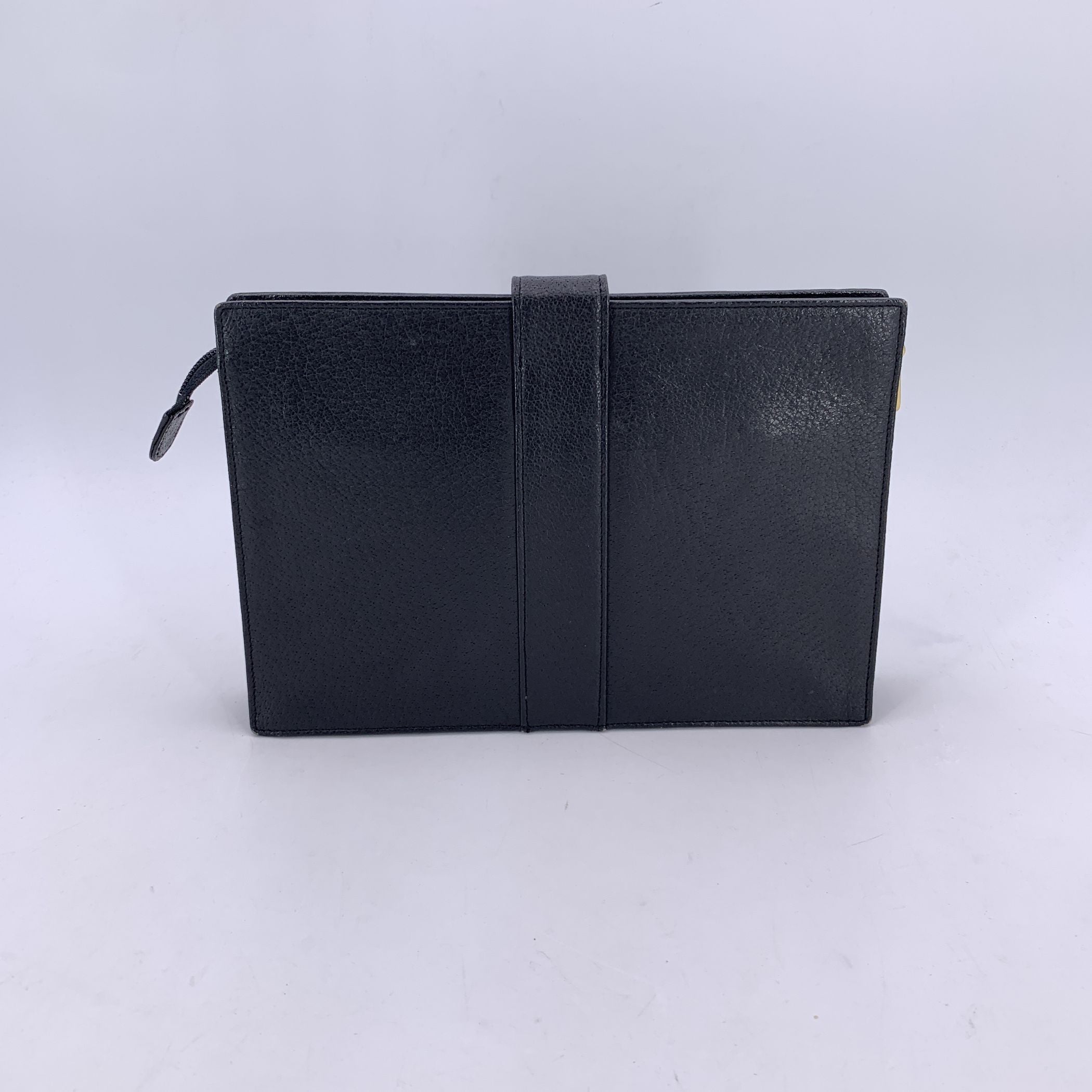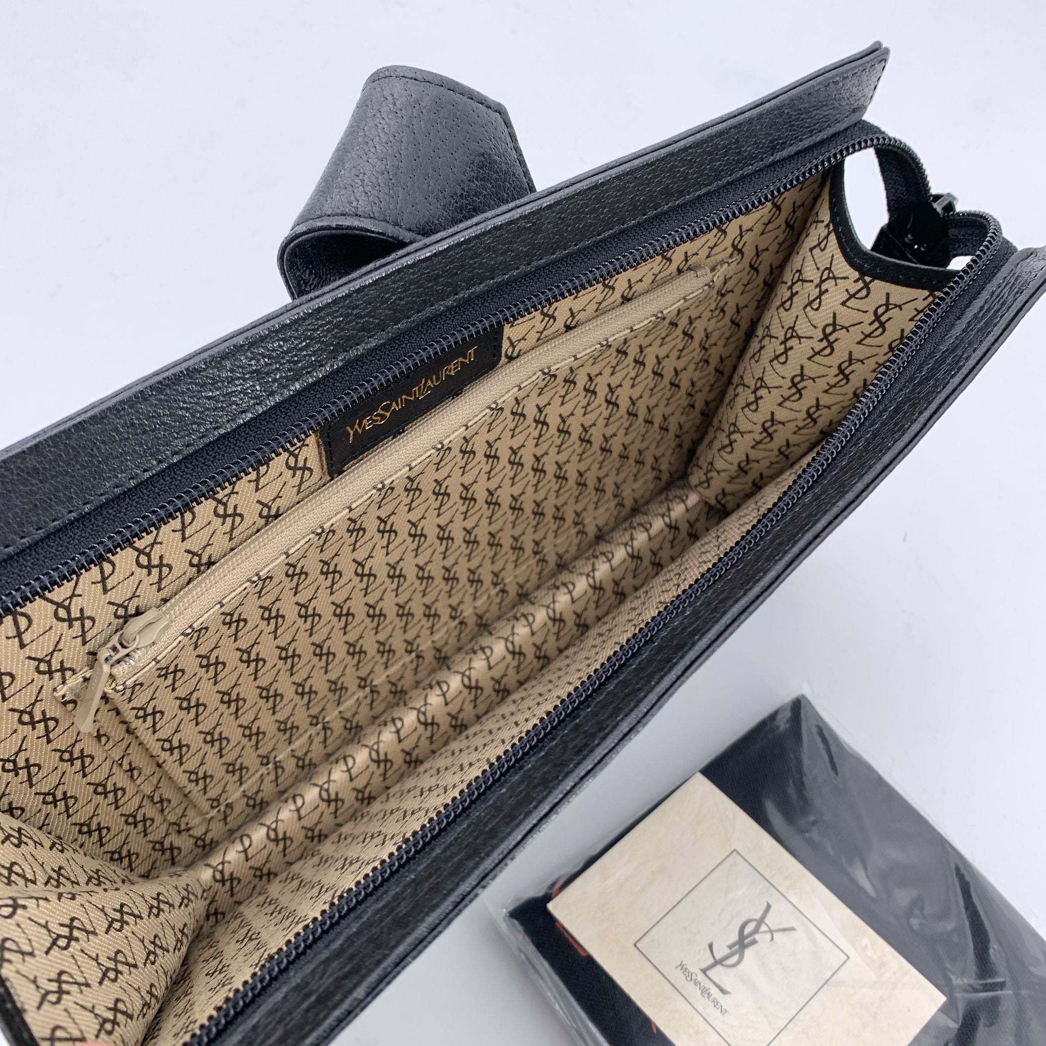 Effortlessly Refined With a Touch Of Parisian Edge, This Yves Saint Laurent Vintage Leather Clutch Bag Is a Quiet Statement Piece From The Golden Age Of Ysl Design. Crafted From Supple Black Leather, Its Sleek Silhouette Is Accented By a Fold-over Strap With Magnetic Button Closure, Layered Over a Secure Upper Zipper - a Design That Balances Elegance With Practicality. On The Front, Two Open Pockets Offer Easy-access Storage, While The Interior Reveals Thoughtful Organization: a Side Zip Pocket And An Open Slip Pocket, All Lined In Signature Beige Monogram Fabric That Adds a Touch Of Subtle Luxury. The Inside Is Finished With The Iconic 'Yves Saint Laurent' Tag - a Mark Of True Vintage Authenticity. Perfect As An Evening Clutch Or a Minimalist Day Bag, This Piece Captures The Spirit Of Classic Saint Laurent: Sophisticated, Smart, And Undeniably Chic.
